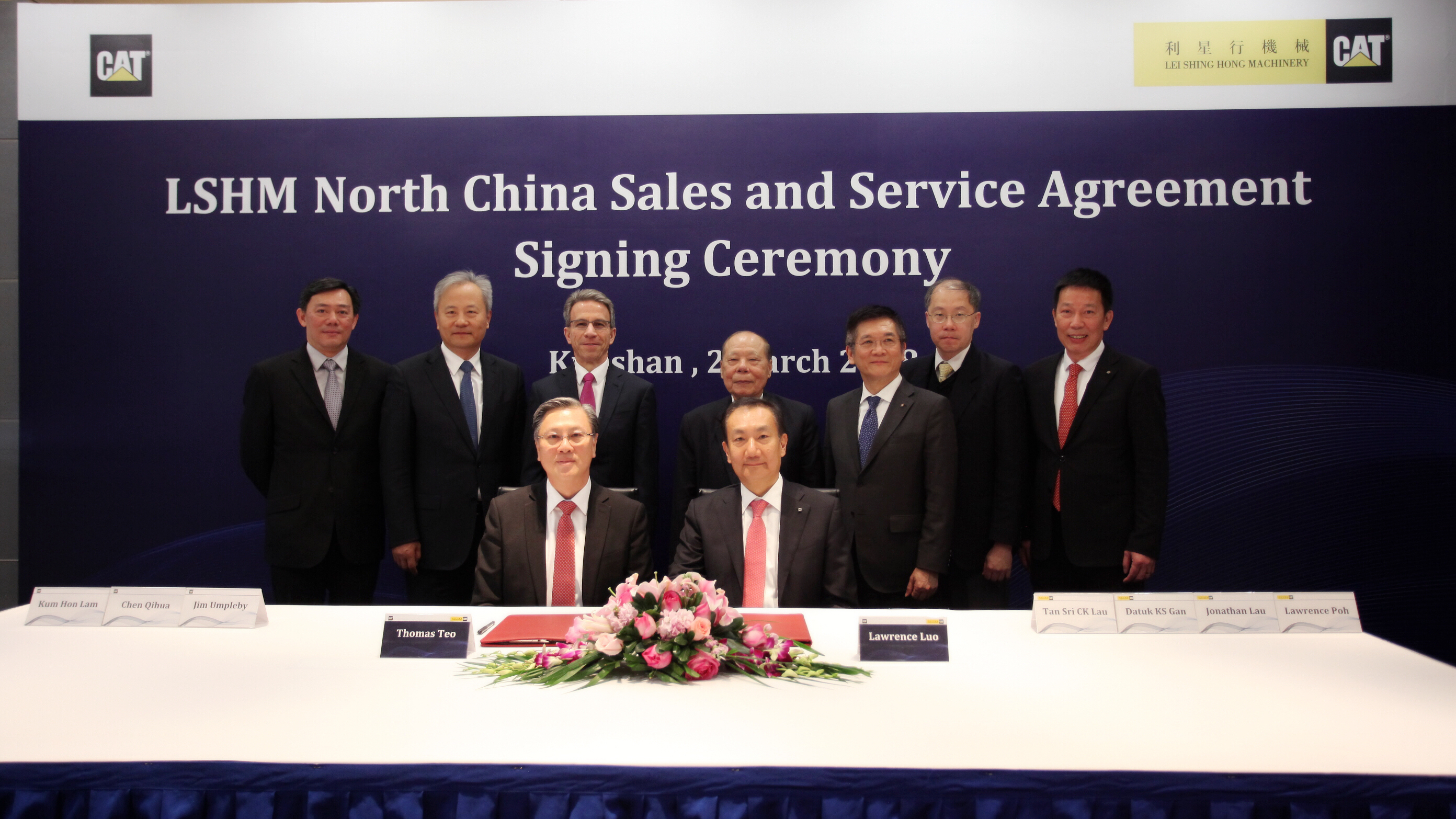 左起:利星行集團(tuán)執(zhí)行董事、利星行機(jī)械集團(tuán)首席執(zhí)行官傅耀生;卡特彼勒全球基礎(chǔ)建設(shè)行業(yè)大中華及韓國(guó)總經(jīng)理林錦漢;卡特彼勒大中華及印度區(qū)分銷服務(wù)總經(jīng)理趙文才;卡特彼勒首席執(zhí)行官安博駿;利星行集團(tuán)董事局主席丹斯里劉楚群;卡特彼勒全球副總裁、卡特彼勒(中國(guó))投資有限公司董事長(zhǎng)陳其華;利星行集團(tuán)首席執(zhí)行官拿督顏健生;利星行機(jī)械集團(tuán)副主席劉國(guó)基