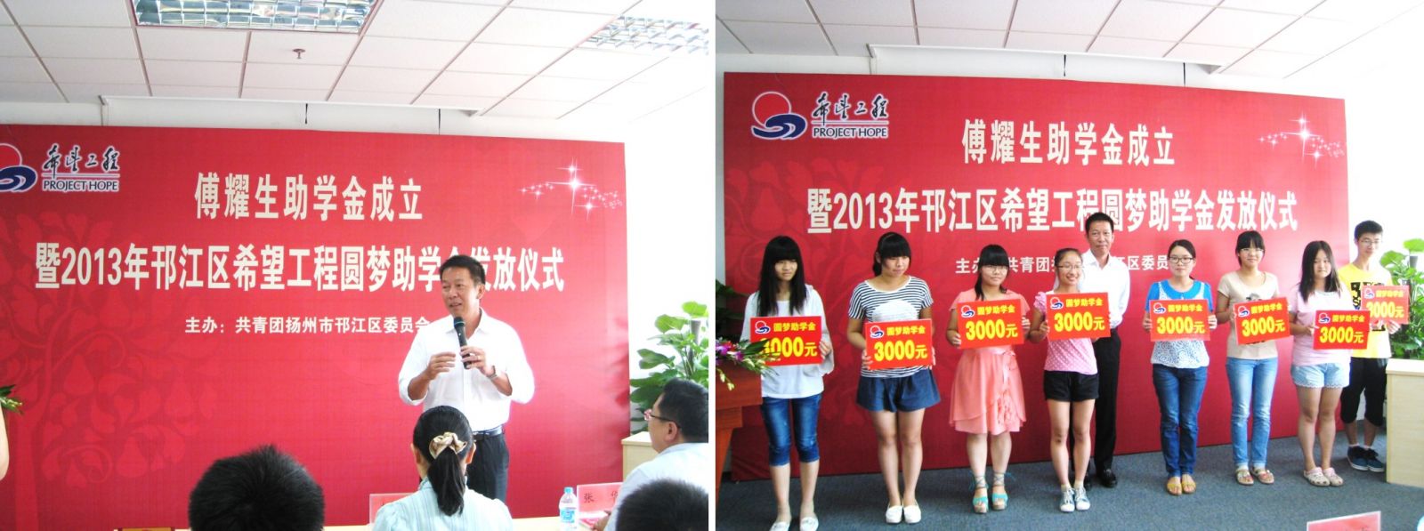 2013年8月27日,“傅耀生助學(xué)金”在揚(yáng)州成立。啟動儀式上,50名剛剛被高校錄取的貧困學(xué)生,在共青團(tuán)揚(yáng)州市邗江區(qū)委員會的帶領(lǐng)下,在利星行機(jī)械(揚(yáng)州)有限公司接受了傅耀生先生的現(xiàn)場捐贈。傅先生表示,能幫助這些經(jīng)濟(jì)困難的優(yōu)秀高中畢業(yè)生順利進(jìn)入高校深造是他本人的心愿,希望這些孩子們努力學(xué)習(xí),畢業(yè)后回到揚(yáng)州做貢獻(xiàn),而利星行機(jī)械的大門也將為他們敞開。