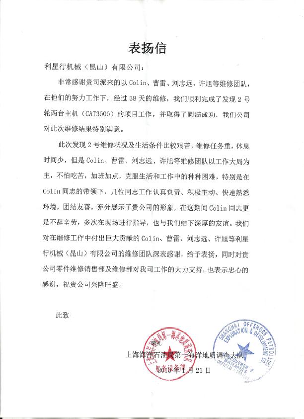 這是一封來自上海海洋石油局的感謝信,他們對(duì)利星行機(jī)械維修團(tuán)隊(duì)給予了高度評(píng)價(jià),通過向客戶提供優(yōu)質(zhì)服務(wù),公司也展現(xiàn)出積極主動(dòng)、團(tuán)結(jié)合作的良好形象,在客戶的肯定聲中獲得雙贏。