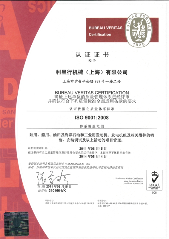 利星行機械獲得ISO9001:2008認證的產品包括:陸用,船用,油田及海洋石油和工業用發動機,發電機組及相關附件的銷售,安裝調試及以上活動的項目管理。